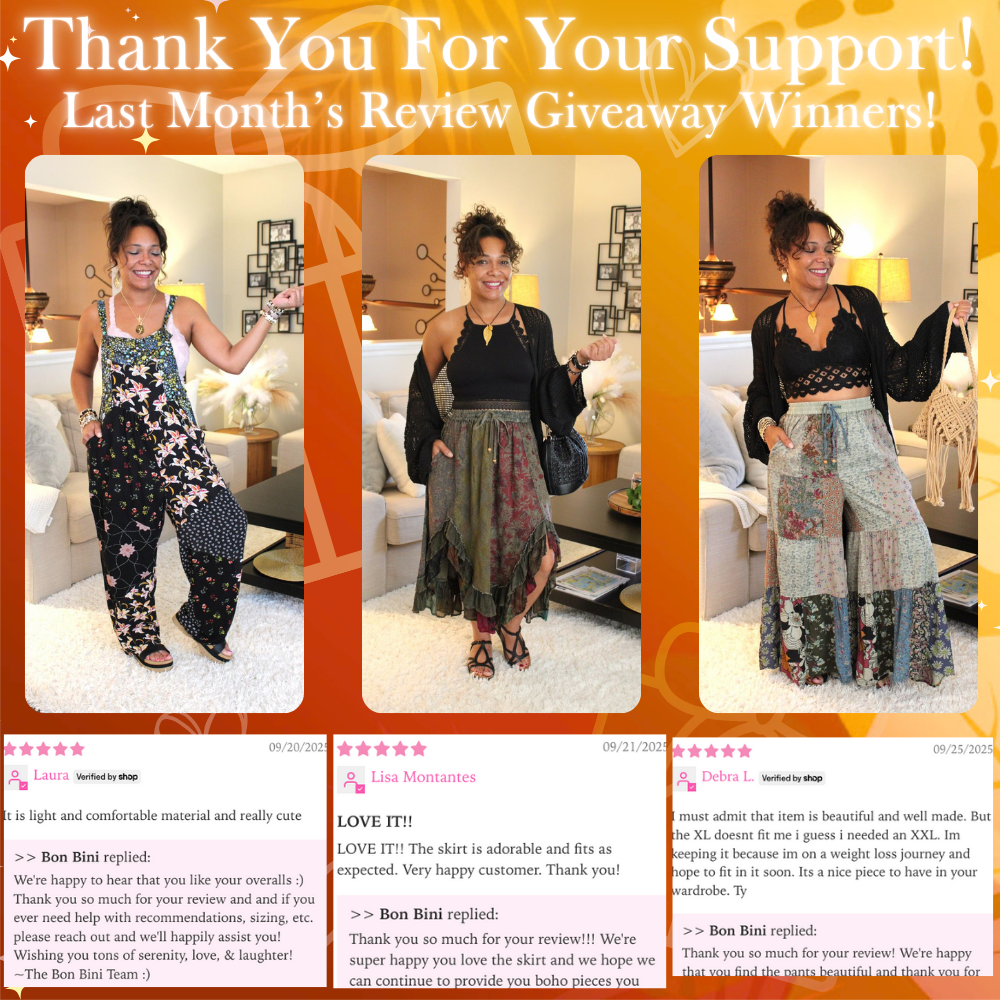Welcome to Bon Bini Boutique where we offer luxury bohemian inspired clothing, gifts, & novelties! Thank you for your interest in us and we look forward to building a long lasting, unparalleled shopping experience for you 😘.