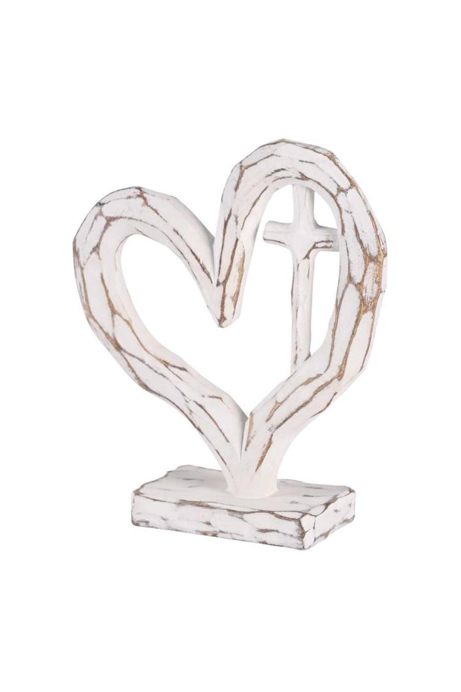 A resin tabletop decor piece that features a heart with a cross inside. Height of heart is 6 In. The heart and cross have a white carved look on a rectangular base.