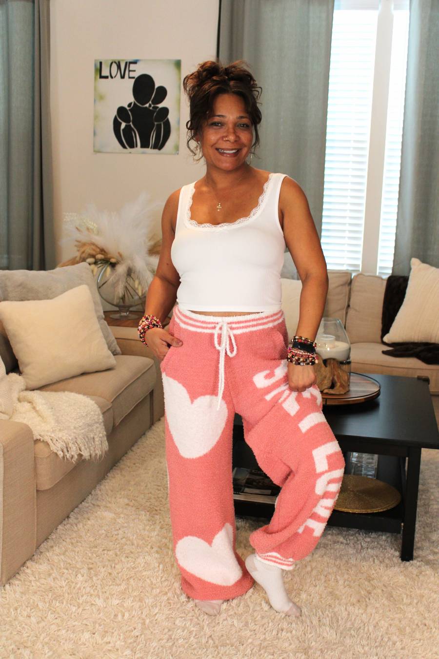 - Super cute design! Features the words "Sweet Love" in white on left leg with multiple white large hearts all over. Also has horizontal pink and white stripes on the waist band and ankles.