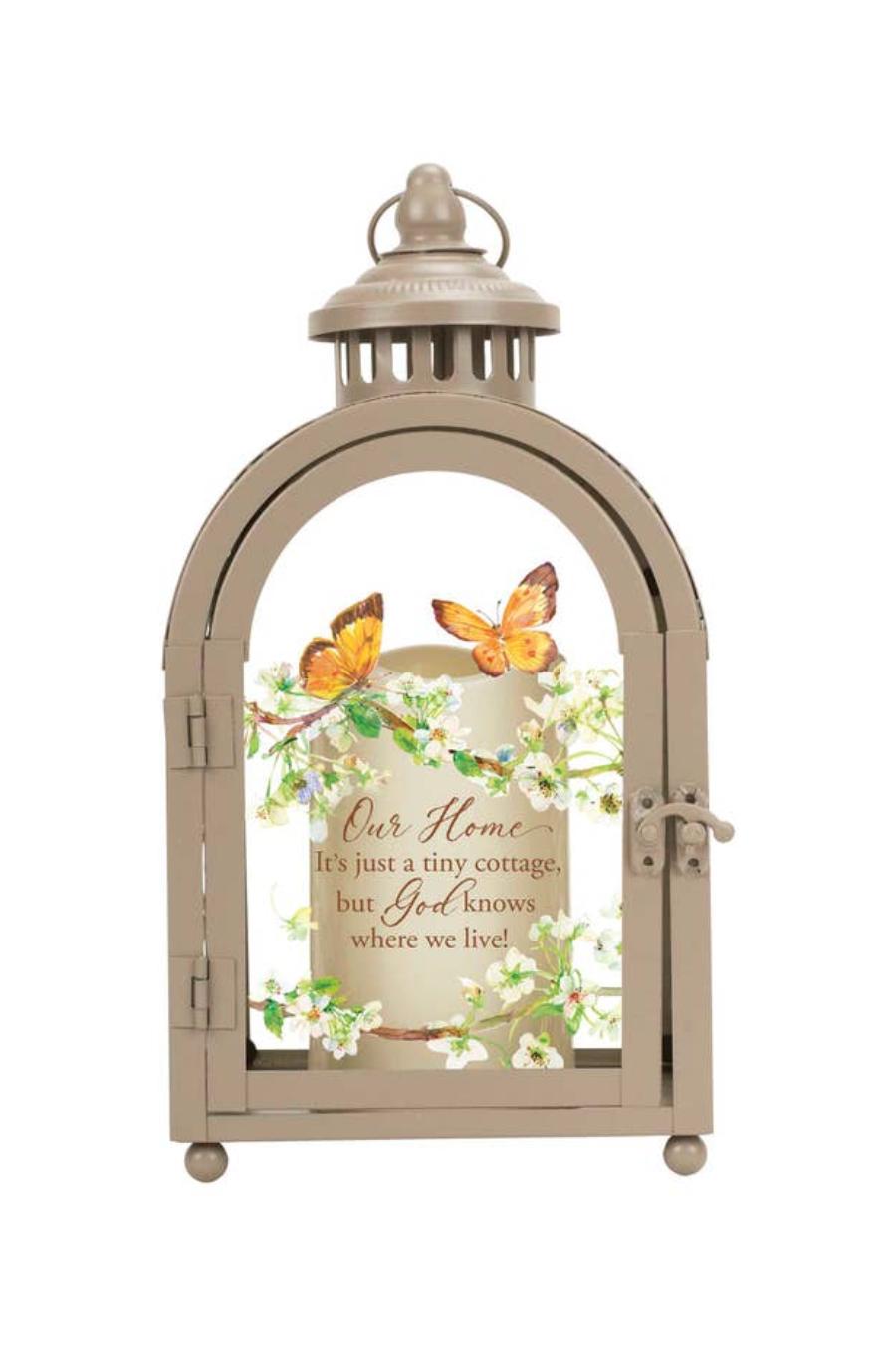 - Displays a heartfelt sentiment "Our Home - It's just a tiny cottage, but God knows where we live!" and a design with white flowers, orange butterflies, & green leaves.