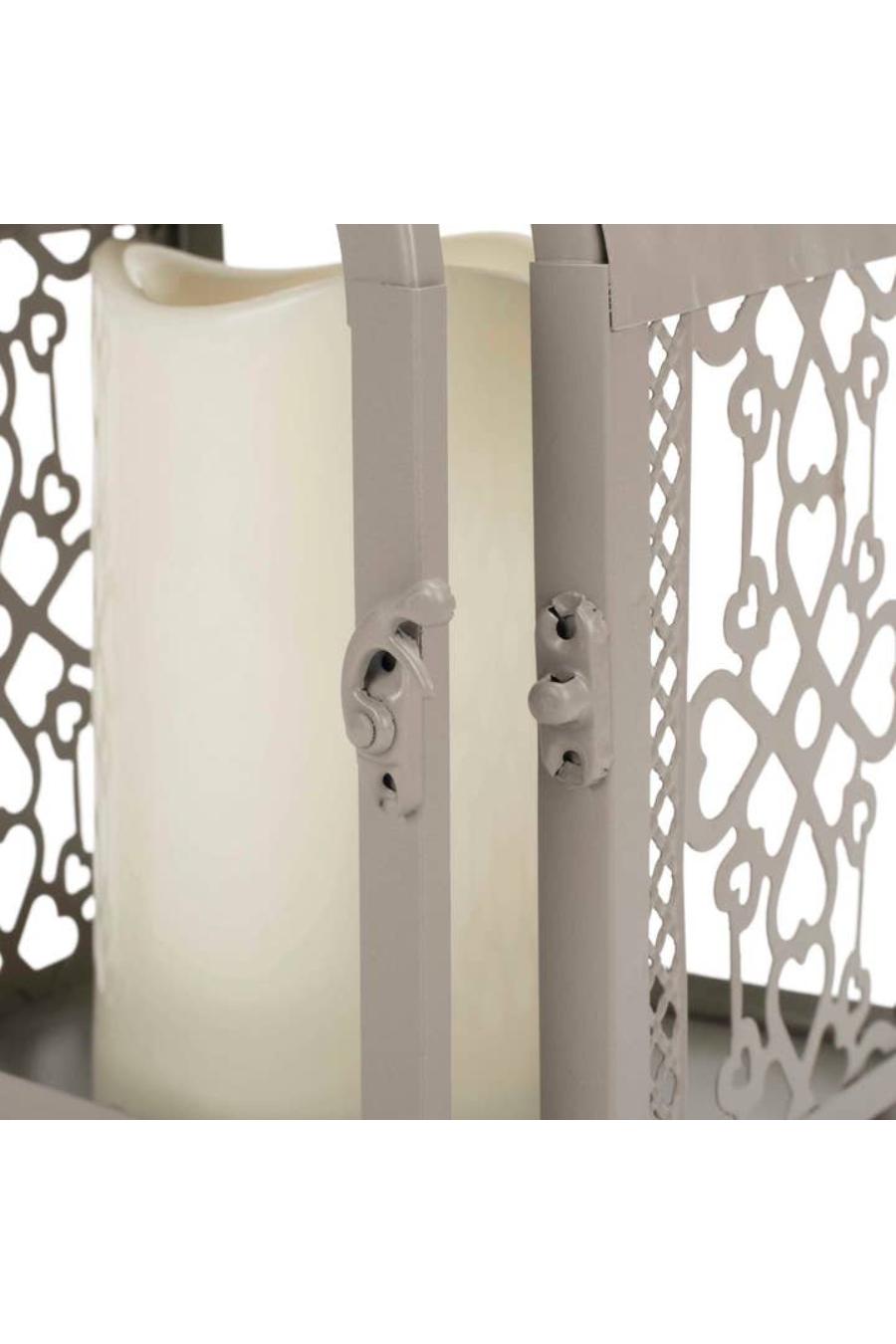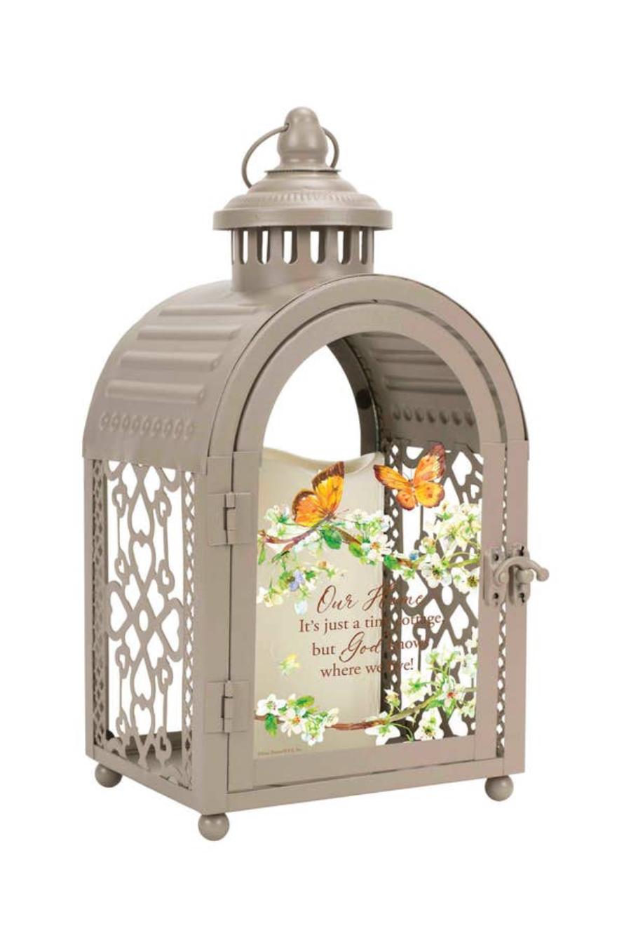- Arch shaped beige metal lantern features lacy open filigree sides along with large glass window in back and on the front door.