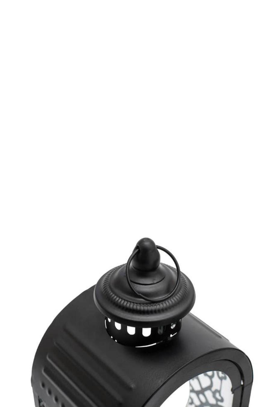 - Arch shaped black metal lantern features lacy open filigree sides along with large glass window in back and on the front door.