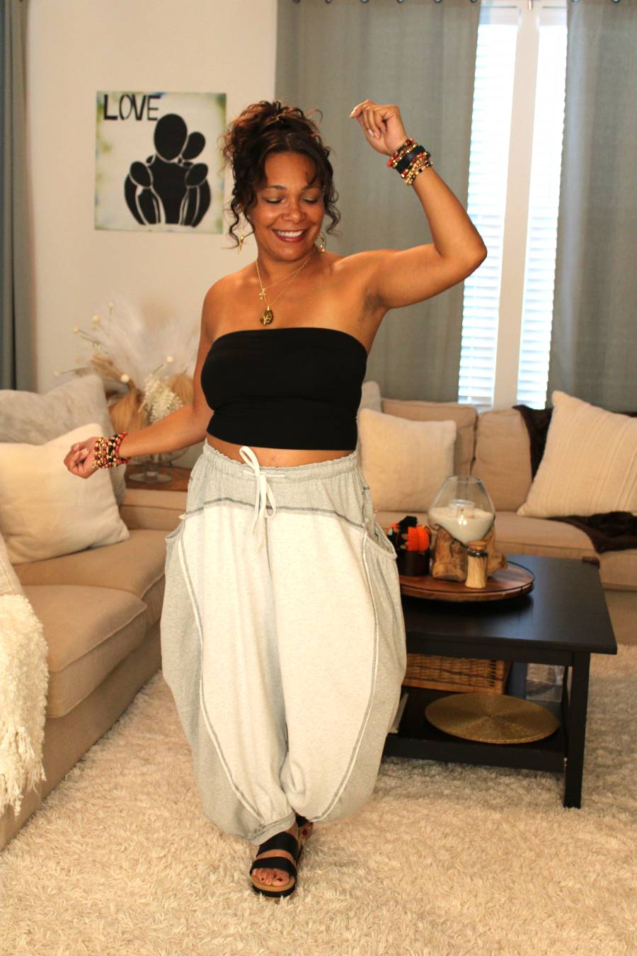 - Elastic waistband and drawstring tie